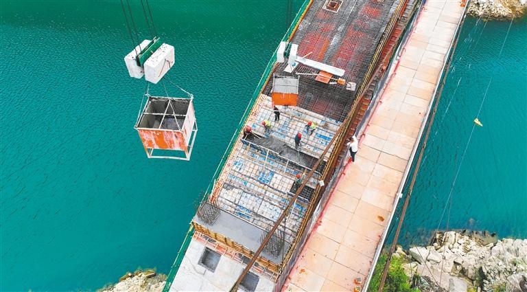 ▶4月11日,重庆市酉阳土家族苗族自治县龚滩镇跨江渡改桥施工现场。该桥建成后,将便利阿蓬江两岸村民出行。