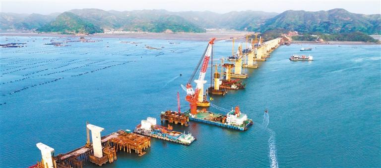 ◀四月十三日,工人在福建霞浦县的宁上高速东吾洋特大桥建设现场加紧施工。