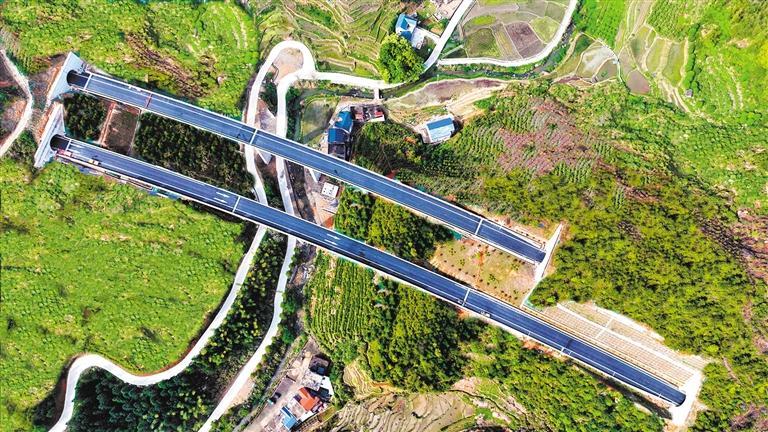 ▼4月14日,建设中的江西遂(川)大(余)高速(遂川段)交织于青山绿野,横亘山峦。