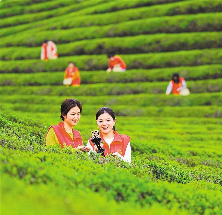 ◀4月7日,江西上高县新界埠镇三星茶园,志愿者在直播采茶过程,邀请网友在线“云品茶”。陈旗海摄(中经视觉)