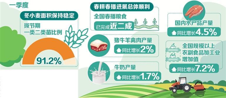 粮油生产开局较好。“紧盯实现今年粮食产量1.4万亿斤左右目标,环环紧扣抓好春管春耕,打牢夏粮和全年粮食丰收基础。”潘文博说。据农业农村部农情调度,冬小麦面积保持稳定,拔节期一类二类苗比例达91.2%,与上年相当、好于常年;冬油菜面积稳中有增,长势好于上年和常年。春耕春播进展总体顺利,全国春播粮食已完成近二成,进度同比略快。