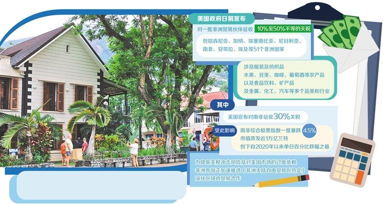 美国政府宣布对一批非洲贸易伙伴征收10%至50%不等的关税,其中包括肯尼亚、加纳、埃塞俄比亚、尼日利亚、南非、安哥拉、埃及等51个非洲国家,涉及服装及纺织品,水果、豆类、咖啡、葡萄酒等农产品,以及食品饮料、矿产品及金属、化工、汽车等多个品类和行业,导致那些对美国市场有较高依赖度的非洲国家面临严峻挑战。