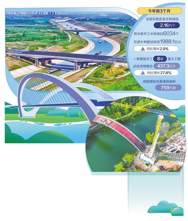 江河纵横,水利工程建设“进度条”持续刷新。水利部数据显示,今年一季度,全国水利基础设施建设实现良好开局,在去年同期高基数之上,水利建设完成投资实现稳中有增。前3个月,全国实施各类水利项目2.16万个,其中新开工水利项目6034个;完成水利建设投资1988.1亿元,同比增长2.9%。