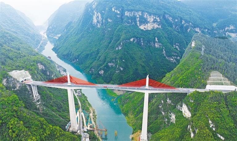 4月21日,重庆市彭水苗族土家族自治县汉葭街道,车辆行驶在渝湘复线高速公路磨寨乌江特大桥上。该高速公路由三个部分组成:重庆巴南至重庆彭水、重庆彭水至重庆酉阳、重庆武隆至贵州道真。目前,重庆巴南至重庆武隆段、重庆彭水至重庆酉阳段已建成通车,在促进沿线旅游资源开发等方面发挥着重要作用。