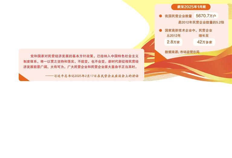 构建新发展格局打开发展空间。畅通国内大循环,必须打破地方保护、区域壁垒,尽快形成全国统一大市场,促进各类要素高效流动、供需有效匹配,这将为民营经济配置资源、扩大市场提供更多契机。同时,我国推进高水平对外开放,主动对接国际高标准经贸规则,稳步扩大制度型开放,也将为民营企业国际化发展拓宽空间。2024年民营企业出口占我国出口总额的比重超64%,是对外直接投资的最大主体,随着对外开放向更大范围、更宽领域、更深层次迈进,民营企业还将在数字经济、绿色经济等经贸合作中获得更多机遇。