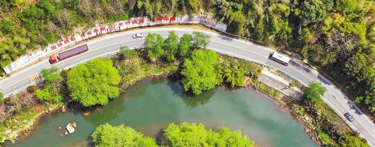 ▲4月3日,江西宜春市宜丰县黄岗镇,平坦整洁的农村公路与树木、河流相互映衬。