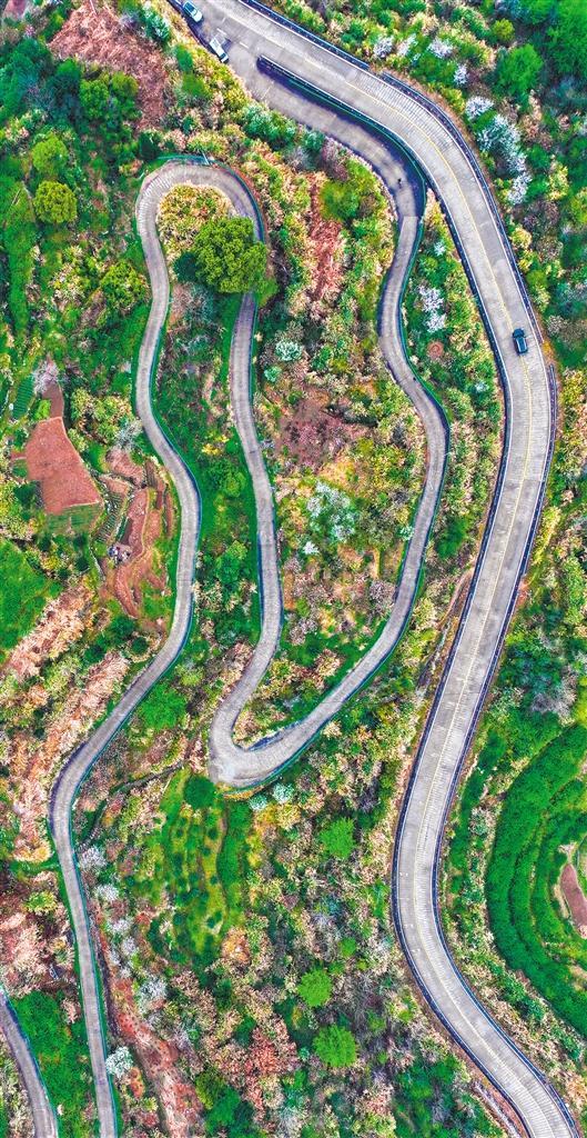 ▶3月30日拍摄的浙江台州市三门县亭旁镇至横渡镇枧头盘山公路。该县已实现“村村通公路、村村通公交”。