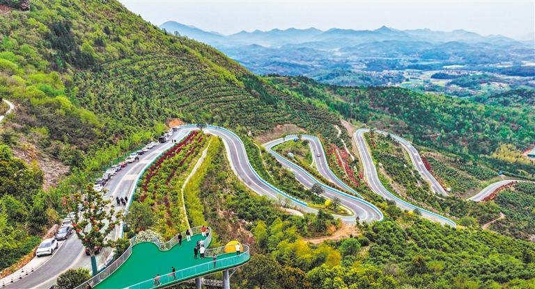 ▼4月4日,游客在安徽合肥市庐江县矾山镇农村公路“六道拐”路段观光。巢志斌摄(中经视觉)