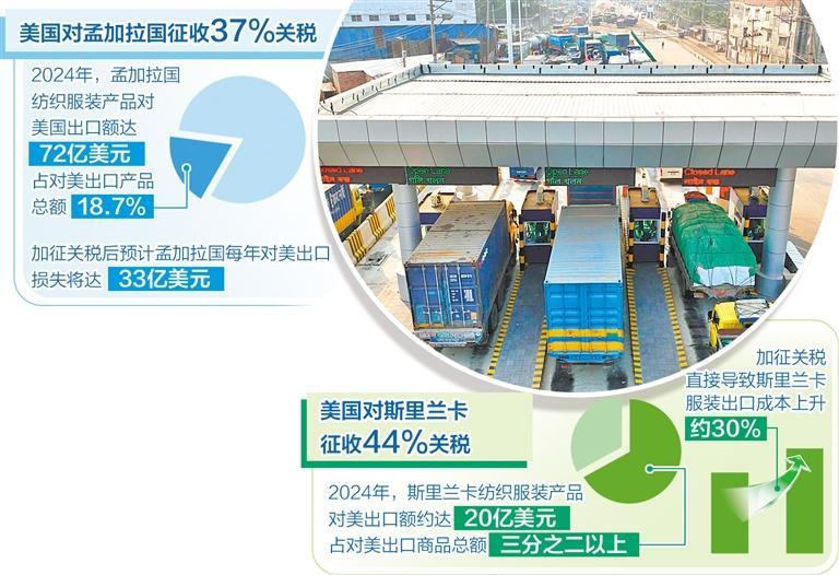 孟加拉国经济高度依赖纺织服装产品出口,美国是孟加拉国除欧盟外的第二大出口市场。作为全球第二大服装产品出口国,2024年,孟加拉国纺织服装产品对美国出口额达到72亿美元,占对美出口产品总额的18.7%。美国所谓“对等关税”生效后,直接冲击孟加拉国纺织服装出口领域,使出口成本大幅增加,严重削弱了孟加拉国产品的价格竞争力。在此背景下,预计孟加拉国每年对美出口损失将达到33亿美元。此外,近期印度政府宣布不再允许孟加拉国经印度陆地海关对第三国出口货物,此举将在短期内进一步推高孟加拉国货物出口成本。