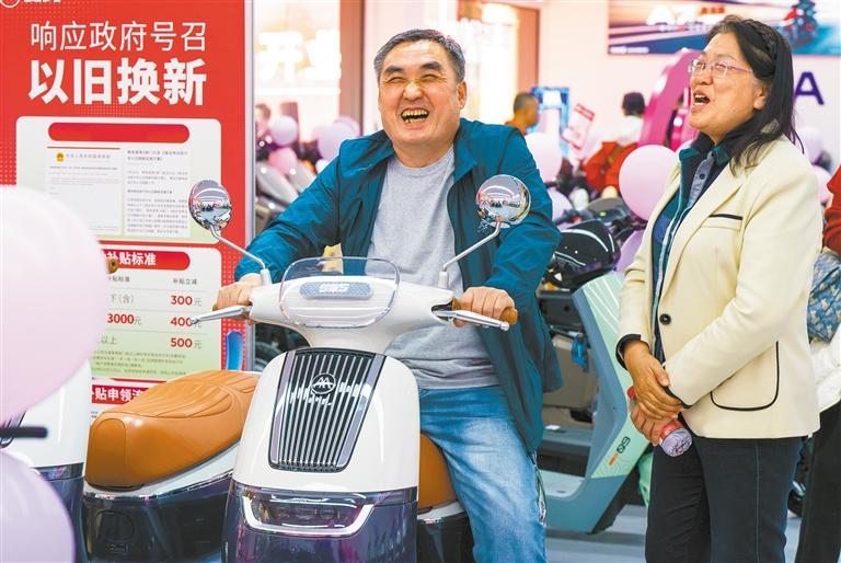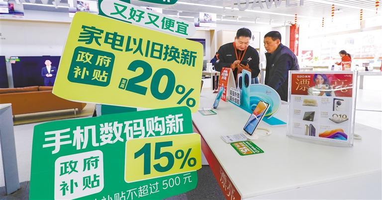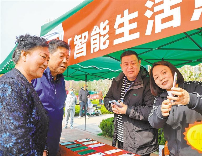 ▶4月9日,河北秦皇岛市白塔岭街道,商家为居民介绍数码产品及购新补贴政策。