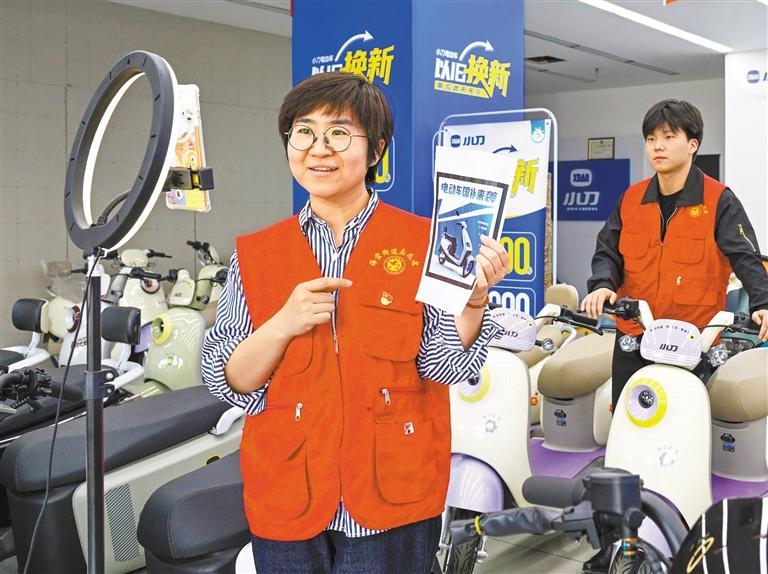 ◀4月15日,安徽合肥市庐阳区海棠街道,党员志愿者向居民直播介绍“以旧换新”相关补贴政策。