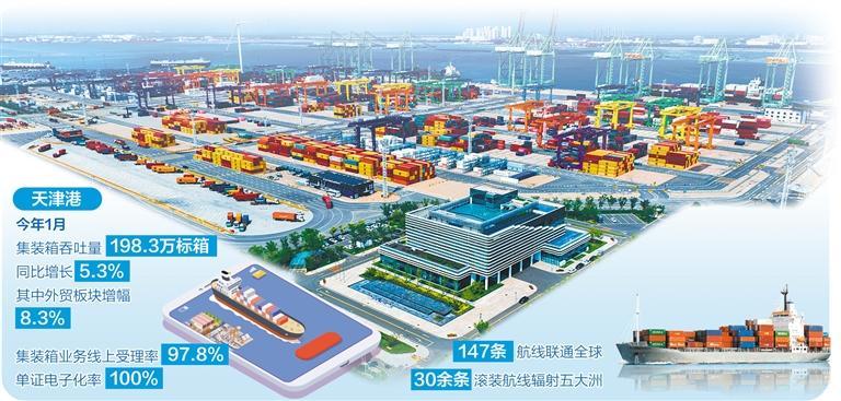 从实现集装箱码头全流程自动化改造,到率先建设港口风光发电设施集群、形成年供应近3亿千瓦时清洁能源绿色矩阵……近年来,天津港集团以推进京津冀协同发展为战略引领,在世界一流智慧港口、绿色港口的建设征程中交出了一份沉甸甸的答卷。今年1月,天津港集装箱吞吐量以198.3万标箱创历史同期新高,同比增长5.3%,其中外贸板块增幅达8.3%,展现出强劲发展动能。