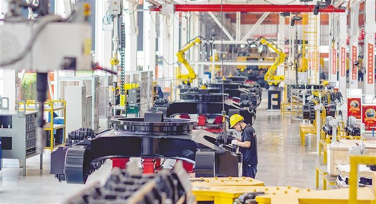 在推进西部陆海新通道建设上,西部地区机械设备制造企业抓住机遇,依托科技赋能,通过实行智能化改造、数字化转型,让一大批更智能优质的工程机械设备走下生产线,走进西部陆海新通道建设一线,助力提升通道建设施工效率的同时,也依托通道带动作用,实现企业高质量发展。图为位于重庆市两江新区的一家机械制造企业,工作人员在总装车间组装即将出口的挖掘机。新华社记者 黄 伟摄
