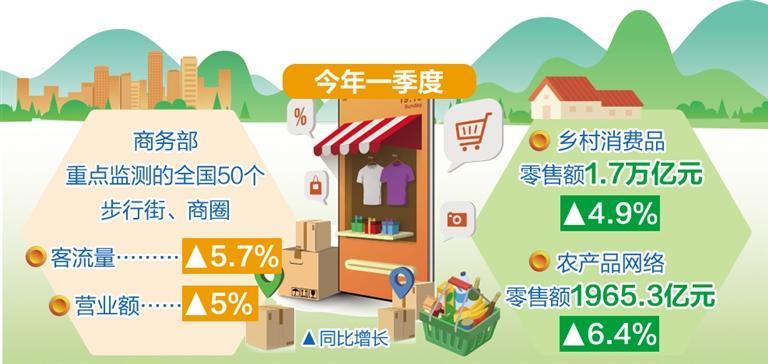 城市商业增速稳定,一季度商务部重点监测的全国50个步行街、商圈客流量、营业额同比分别增长5.7%、5%。县域消费市场持续升温,乡村消费品零售额1.7万亿元,同比增长4.9%,增速高于城镇0.4个百分点。农村电商蓬勃发展,全国农村网络零售额6697.5亿元,同比增长5.1%;农产品网络零售额1965.3亿元,同比增长6.4%。