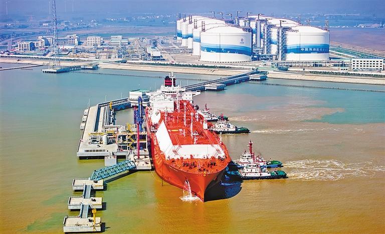 4月28日,江苏省盐城市,满载7万吨LNG(液化天然气)的法国“费罗尔”号靠泊在中国海油盐城“绿能港”码头,开展卸料作业。“绿能港”具有LNG接收、储存、外输功能,年外输能力约1120万吨。
