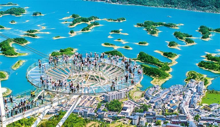 5月1日,湖北省黄石市阳新县仙岛湖,游客在“天空之镜”玻璃观景平台欣赏仙岛湖风光,乐享假日时光。