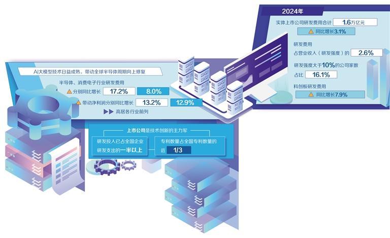 研发投入保持高位。截至2024年底,超半数上市公司聚焦战略性新兴产业,新上市公司中超八成集中在新一代信息技术、高端装备制造、新材料、新能源汽车、生物、节能环保、航空航天、新能源八大行业,新质生产力持续赋能上市公司业绩增长。上市公司是技术创新的主力军,研发投入已占全国企业研发支出的一半以上,专利数量占全国专利数量的近1/3。2024年,实体上市公司研发费用合计1.6万亿元,同比增长3.1%;研发费用占营业收入(研发强度)的2.6%。研发强度大于10%的公司家数占比16.1%。科创板研发费用同比增长7.9%。