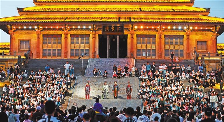 ▼5月1日,游客在山东临沂市郯城县郯国古城景区观看实景演出。