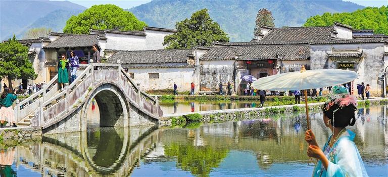▼4月13日,安徽黄山市黟县宏村的徽派民居与湖水交相辉映,吸引众多游客前来观光游玩。程启群摄(中经视觉)