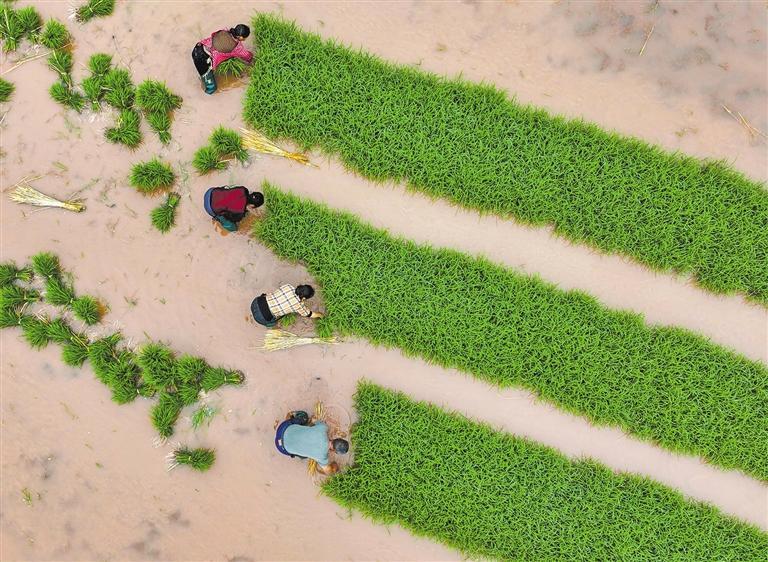 5月6日,重庆市垫江县五洞镇卧龙村村民在田里移栽秧苗。近年来,当地通过建设高标准农田、推广优质水稻、完善水利设施等举措,不断夯实粮食生产基础,提升粮食综合生产能力,有效促进农民增收。龚长浩摄(中经视觉)