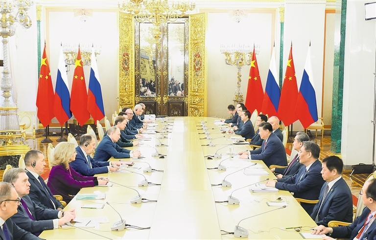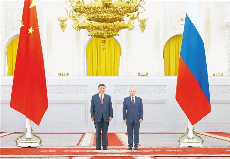 习近平指出,近年来,在双方共同努力下,中俄关系保持稳定、健康、高水平发展态势,长期睦邻友好、互利合作共赢成为两国关系的鲜明特征。两国政治互信根基越扎越深,务实合作纽带越系越牢,人文交流和地方交往越来越红火,新时代的中俄关系更加从容自信、稳定坚韧。历史和现实充分证明,持续发展和深化中俄关系,是传承两国人民世代友好的应有之义,是双方彼此成就、促进各自发展振兴的必然选择,也是捍卫国际公平正义、推进全球治理体系改革的时代呼唤。