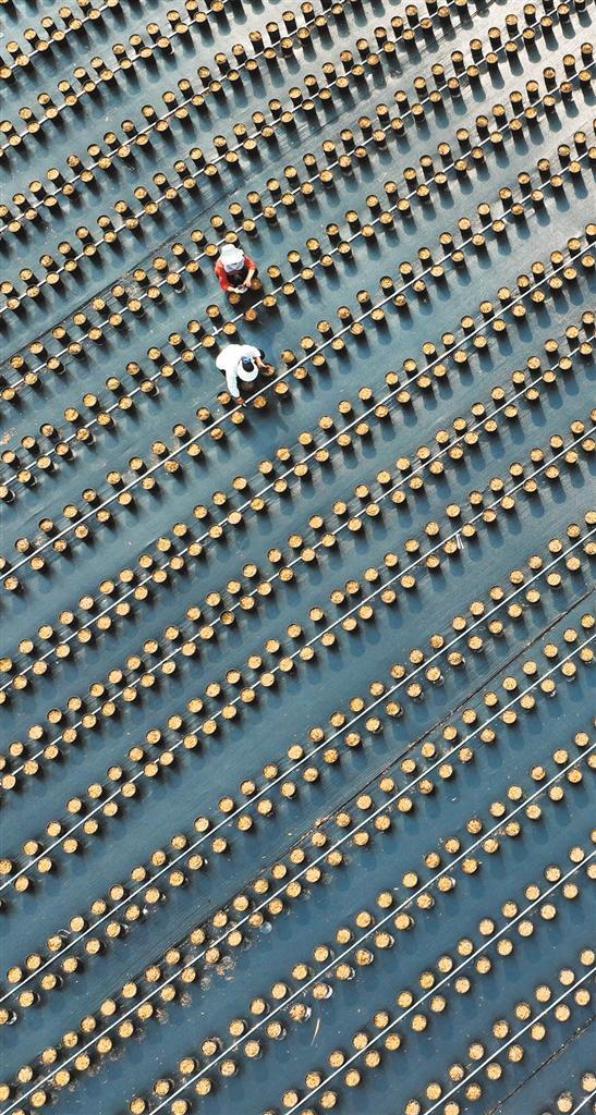 ▶5月5日,甘肃张掖市老寺庙农场辣椒种植基地,菜农使用无人机运送辣椒苗。