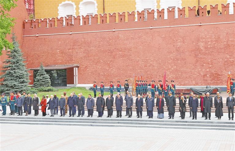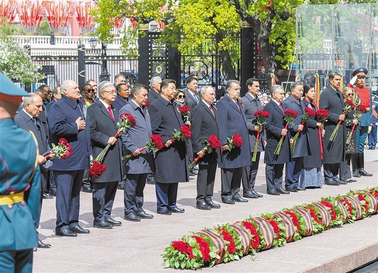庆典结束后,习近平同其他国家领导人一起从红场来到亚历山大花园,向无名烈士墓献花,并肃立默哀。随后,各国领导人集体合影留念。