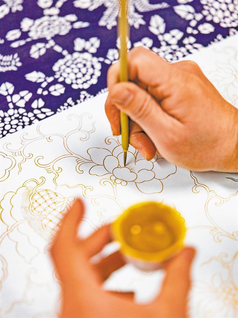 在纸笺加工技艺中,最难的要数“手绘描金粉蜡笺”。粉蜡笺源于唐代,随着时代变迁,其工艺也逐渐失传。1997年,经过数百次的试验,刘靖成功将其恢复。在此基础上,他又相继恢复了泥金笺、朱砂笺、流沙笺、刻画笺等一系列传统纸笺加工技艺,让古法造纸技术焕发新生。2008年,纸笺加工技艺入选第二批国家级非物质文化遗产名录。