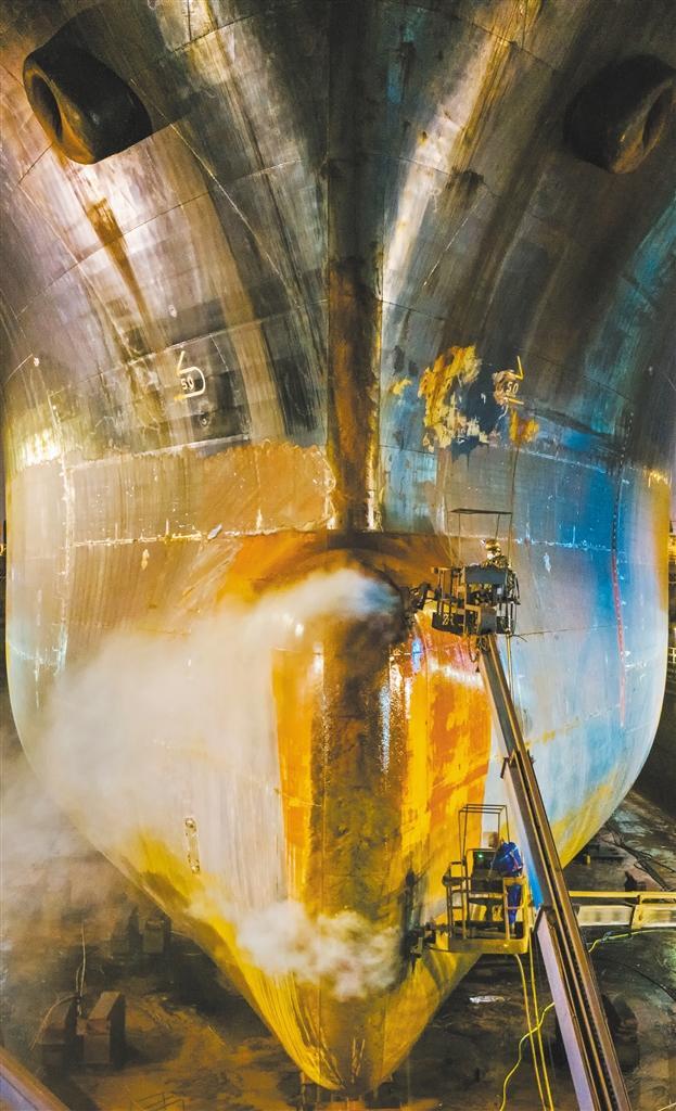 ▶5月1日,位于广州市黄埔区的广东中远海运重工有限公司,工人对船舶进行除锈、除漆、清洗作业。