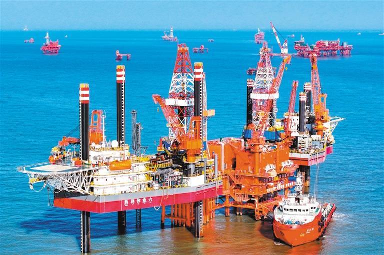▲4月29日,胜利油田海上施工船舶在配合对埕北22F平台化学驱油井进行检修作业。张 灿摄(中经视觉)