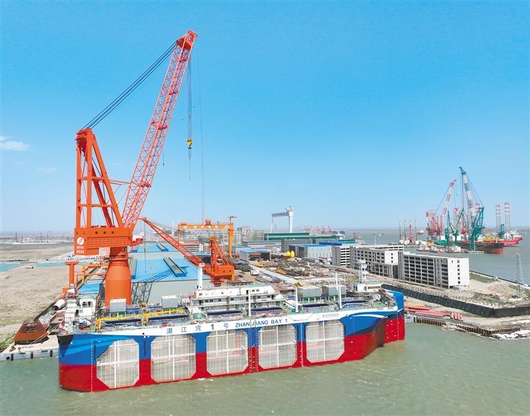 ◀4月14日,江苏省南通市通州湾高端装备临港产业园,全球首艘漂浮式动力定位全域化网箱型工船“湛江湾一号”下水。