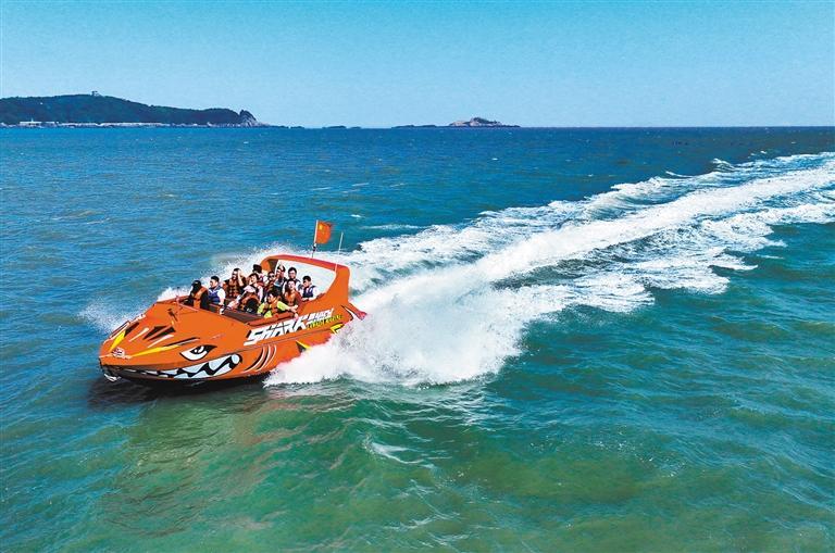 ▶5月2日,游客在浙江省舟山市朱家尖南沙景区体验海上摩托艇。