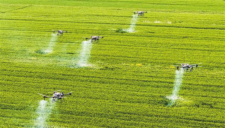 五月十一日,山西省运城市平陆县一家合作社利用植保无人机开展“一喷三防”作业,确保夏粮增产丰收。