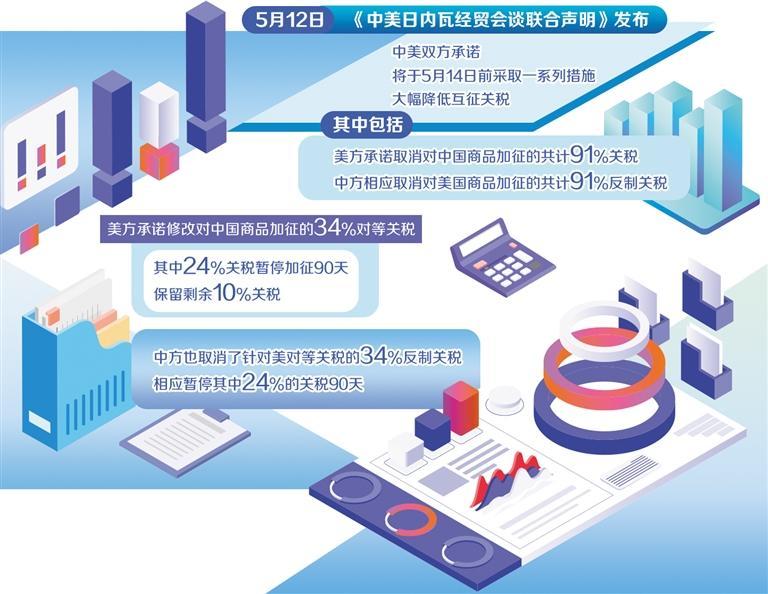 当地时间5月10日至11日,中美双方代表团在瑞士日内瓦举行中美经贸高层会谈,双方通过坦诚、深入、具有建设性的沟通,达成了一系列重要共识,会谈取得实质性进展。根据5月12日发布的《中美日内瓦经贸会谈联合声明》,双方承诺将于5月14日前采取一系列措施,大幅降低互征关税,并建立机制继续就经贸关系进行磋商。