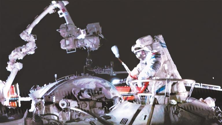这是5月22日在北京航天飞行控制中心屏幕上拍摄的神舟二十号航天员陈冬出舱的画面(视频截图)。5月22日,神舟二十号航天员乘组圆满完成第一次出舱活动,这是进入空间站应用与发展阶段以来,航天员首次通过天和核心舱节点舱出舱,航天员出舱与货物出舱任务首次关联耦合实施。新华社记者 厉彦辰摄