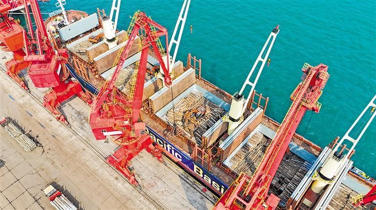 5月22日,山东港口日照港岚山港区,装载木材的货轮在卸船作业。日照港是我国重要的木材进口港,前4个月木材吞吐量同比增长5.5%。