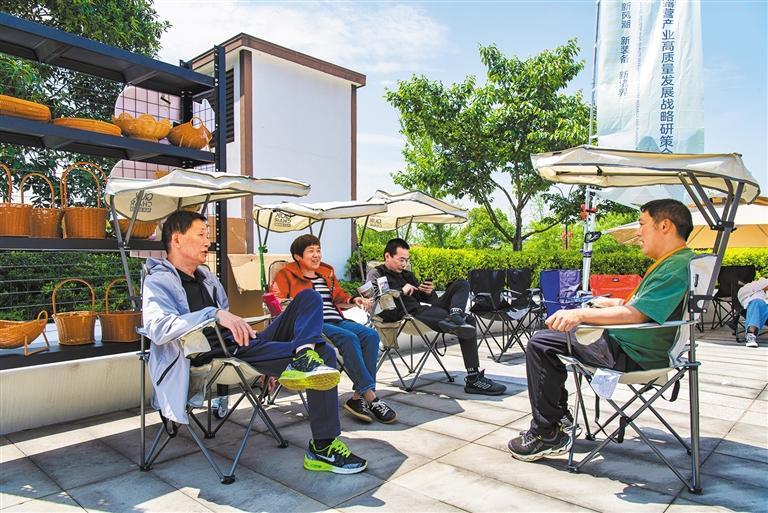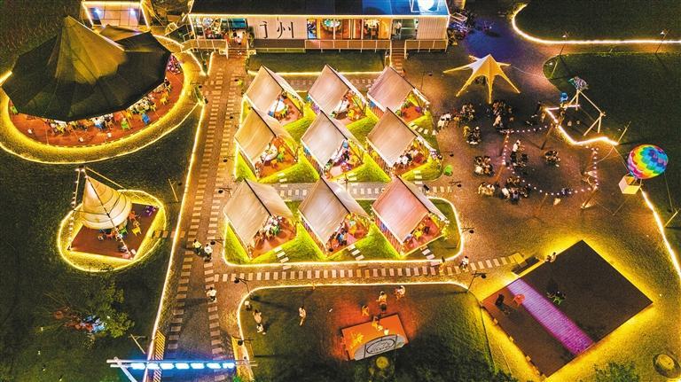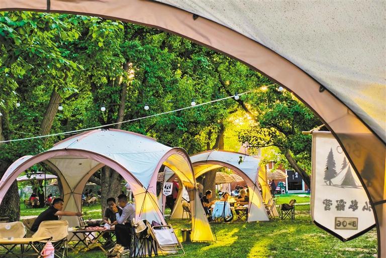◀5月20日,位于湖南省永州市冷水滩区菱角山街道的一家露营基地,顾客络绎不绝。当地不断丰富露营业态,为市民提供星空露营、高山露营、城市露营等多元露营体验。