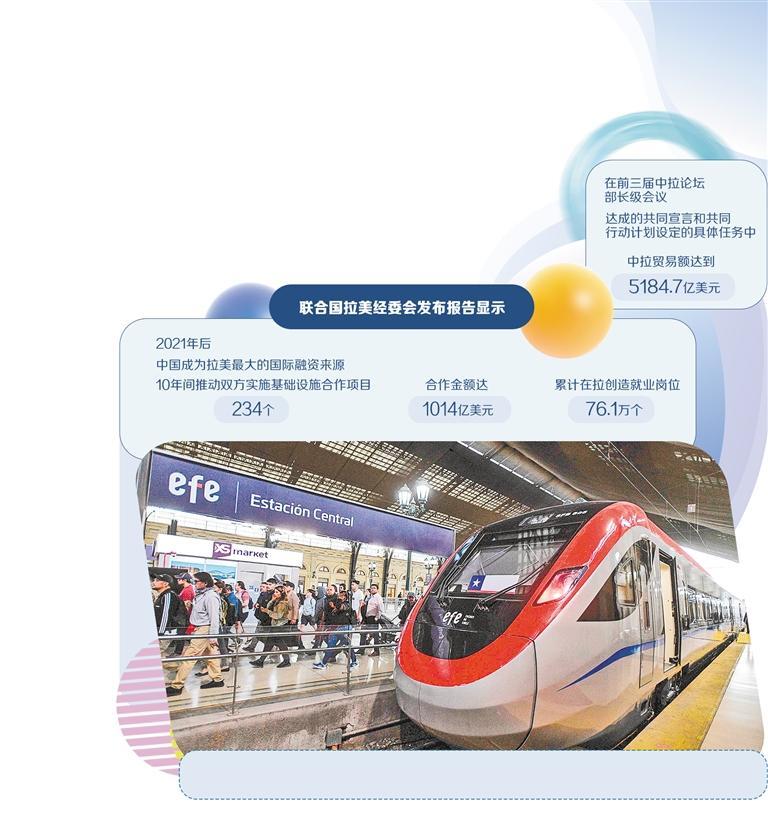 中拉论坛正式运行10年来,双方合作进展迅速,成果丰硕。2015年至2024年,中拉贸易额增长两倍多,中国在拉投资存量增长5倍左右,分别是同期中国对外贸易总额与对外直接投资存量增速的1.5倍与2.7倍。联合国拉美经委会近期发布的报告显示,2021年后,中国成为拉美最大的国际融资来源,中拉金融合作与基础设施合作融合发展,10年间推动双方实施基础设施合作项目234个,合作金额达1014亿美元,累计在拉创造76.1万个就业岗位。中拉合作跑出“加速度”,充分发挥了中拉论坛的积极作用。