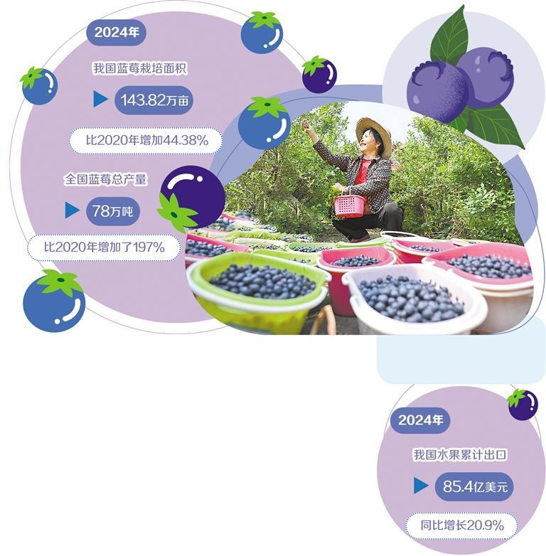 数据显示,2020年国产蓝莓总产量超越美国,居全球首位。2024年,我国蓝莓栽培面积143.82万亩,比2020年增加44.38%;全国蓝莓总产量78万吨,比2020年增加了197%。