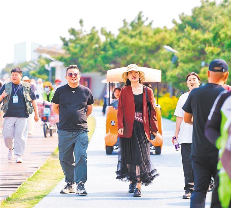 ◀五月二十四日,游客在山东日照市阳光海岸绿道散步游玩。该市对沿线生态薄弱的地方进行修复提升,绿色空间不断扩展。本报记者 高兴贵摄