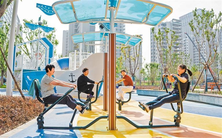 ▶5月20日,居民在江苏南通市金新街道一口袋公园里运动健身。