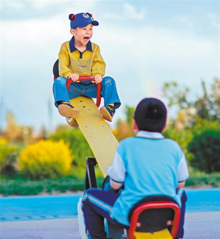 ▲5月23日,小朋友在甘肃张掖市甘州区福盛园南郊口袋公园玩跷跷板。