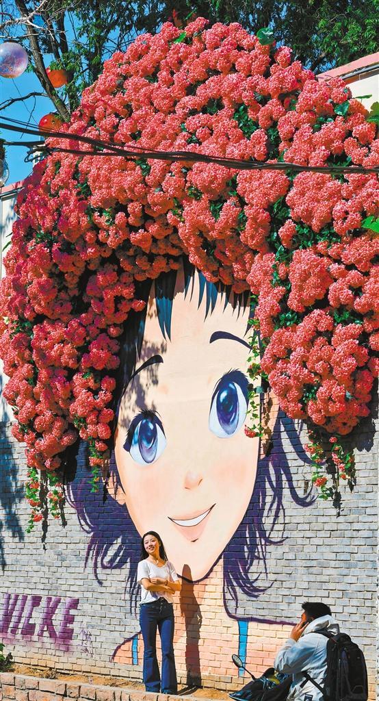 ▼5月14日,游客在内蒙古呼和浩特新城区东护城河北街一处装置艺术微景观前拍照留念。