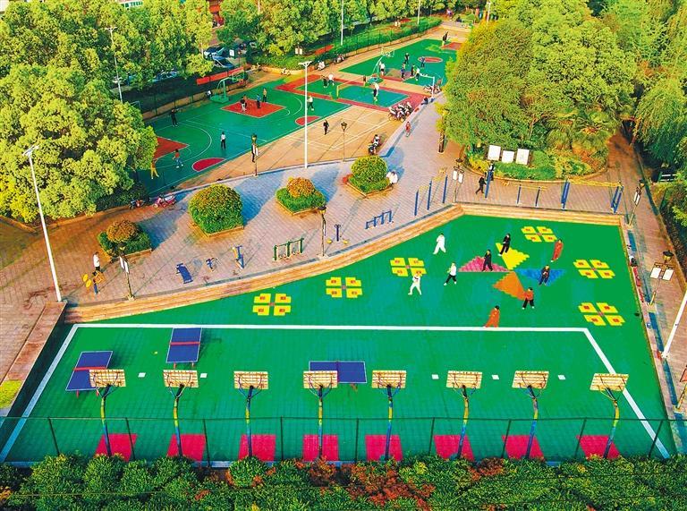▼4月29日,市民在安徽安庆市岳西县城市口袋体育公园打球、健身。