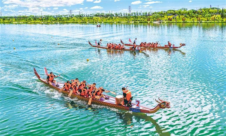 5月31日,参赛选手在内蒙古呼和浩特首届大黑河端午节龙舟赛上挥桨竞渡。端午佳节之际,全国各地纷纷举办丰富多样的民俗活动,吸引了众多市民和游客参与。丁根厚摄(中经视觉)