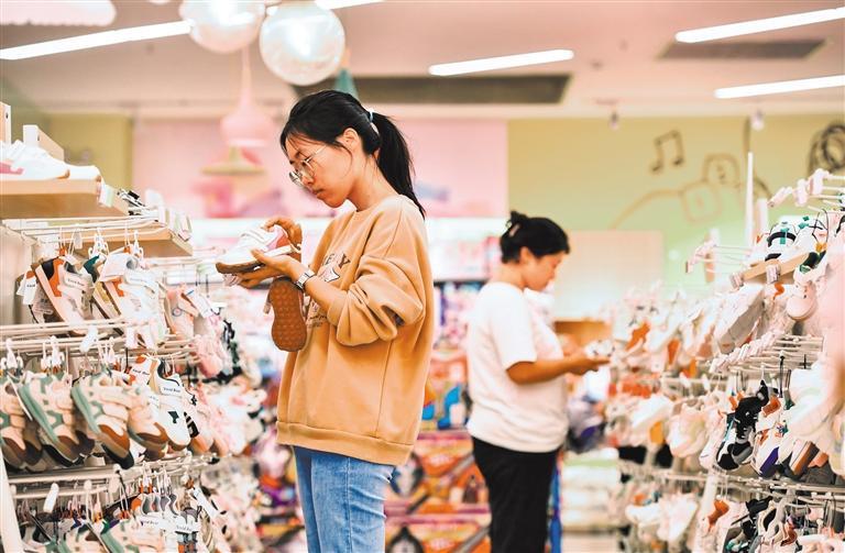 ◀5月29日,江西省宜春市袁州区下浦街道东湖社区的一家儿童用品店,顾客在选购商品。