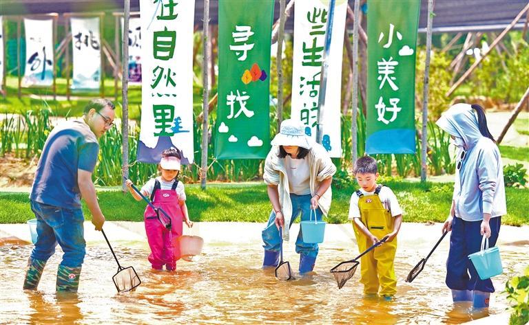 ▲5月24日,位于山东省日照市东港区的归耘农场,小朋友在感受亲子捕捞的乐趣。