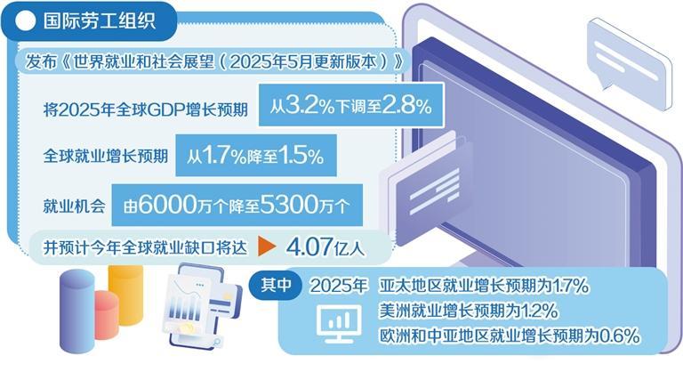 日前,国际劳工组织发布《世界就业和社会展望(2025年5月更新版)》报告提出,受地缘政治紧张、贸易中断和持续不确定性影响,全球经济与就业形势趋于脆弱,2025年全球国内生产总值(GDP)增长预期从3.2%下调至2.8%,全球就业增长预期从1.7%降至1.5%,就业机会由6000万个降至5300万个。