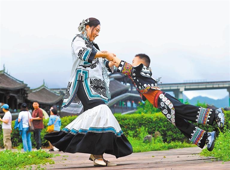 ▲6月1日,游客穿着当地特色服饰在重庆市黔江区濯水古镇游玩。