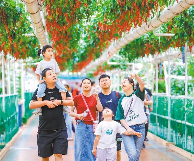 ◀6月1日,游客在山东省潍坊市寿光蔬菜高科技示范园内观光游玩。